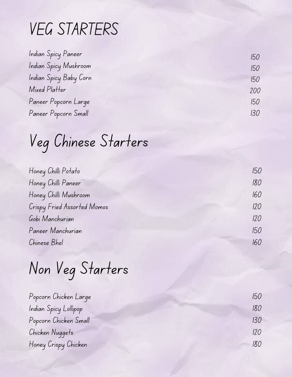 - Non-Veg Starters: Includes options like Popcorn Chicken (available in large and small sizes), Indian Spicy Lollipop, Chicken Nuggets, and Honey Crispy Chicken. These dishes cater to those looking for meat-based appetizer-style items.