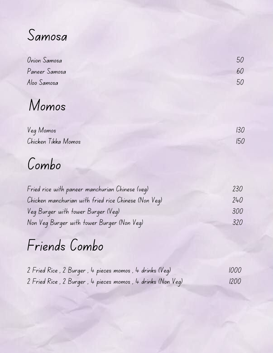 The menu is designed to support quick and convenient ordering, complementing the gaming and cafe experience. These food items are suitable for light meals or snacks during gaming sessions or casual visits. While the primary focus is on starters and small plates, the variety ensures both vegetarian and non-vegetarian preferences are accommodated.